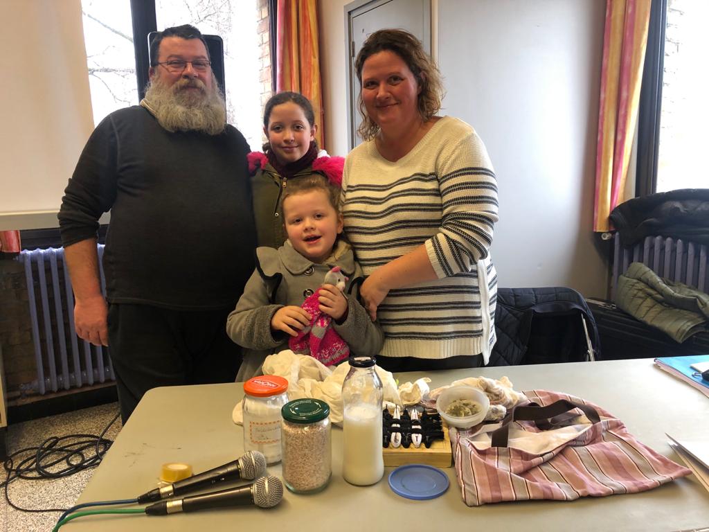 Cette conférence nous a aussi permis de rencontrer une famille très investie aux zéro déchets. Nous avons pu voir comment faire du lave vaisselle bio, du shampoing, des lacés et plus. Voici leur photo :